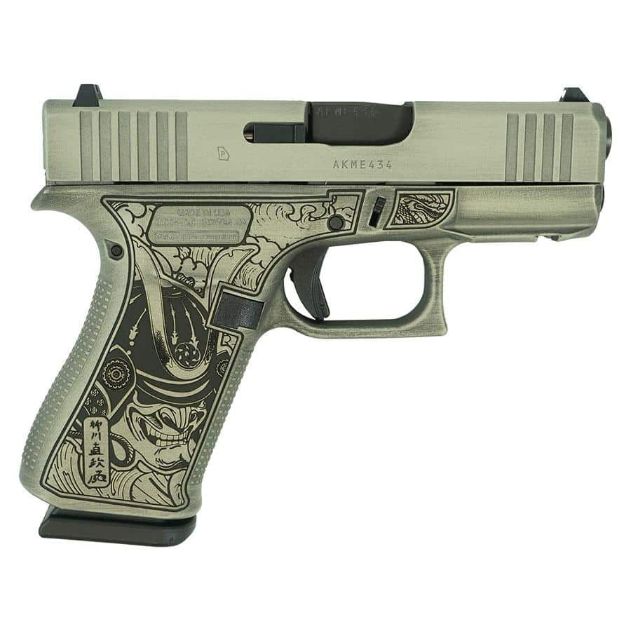 Glock 43x Custom “Bushido Mask” Battleworn Slide Sand Handgun 9mm Luger 10rd Magazines (2) 3.4″ Barrel Accessory Rail USA Made