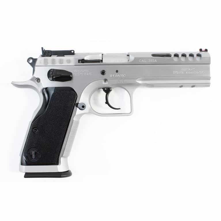 Finished in hard chrome the Stock Master is equipped with ambidextrous safeties a fiber optic front sight and a fully adjustable rear SuperSight for optimal targeting. Each pistol ships with two magazines ensuring readiness for competition straight out of the box.