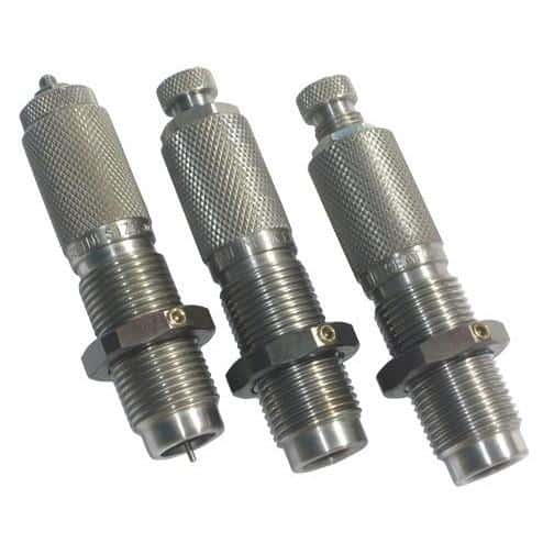 Lyman straight wall rifle cases require these 3-Die Sets consisting of a full length resizing die with decapping stem a two step neck expanding die and a bullet seating die. These sets are ideal for loading cast bullets due to the inclusion of the neck expanding die.